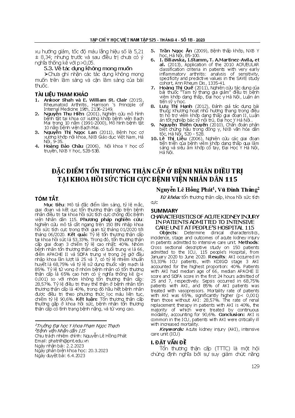 Đặc điểm tổn thương thận cấp ở bệnh nhân điều trị tại Khoa Hồi sức tích cực Bệnh viện Nhân Dân 115 = Characteristics of acute kidney injury in patients admitted to intensive care unit at People's hospital 115