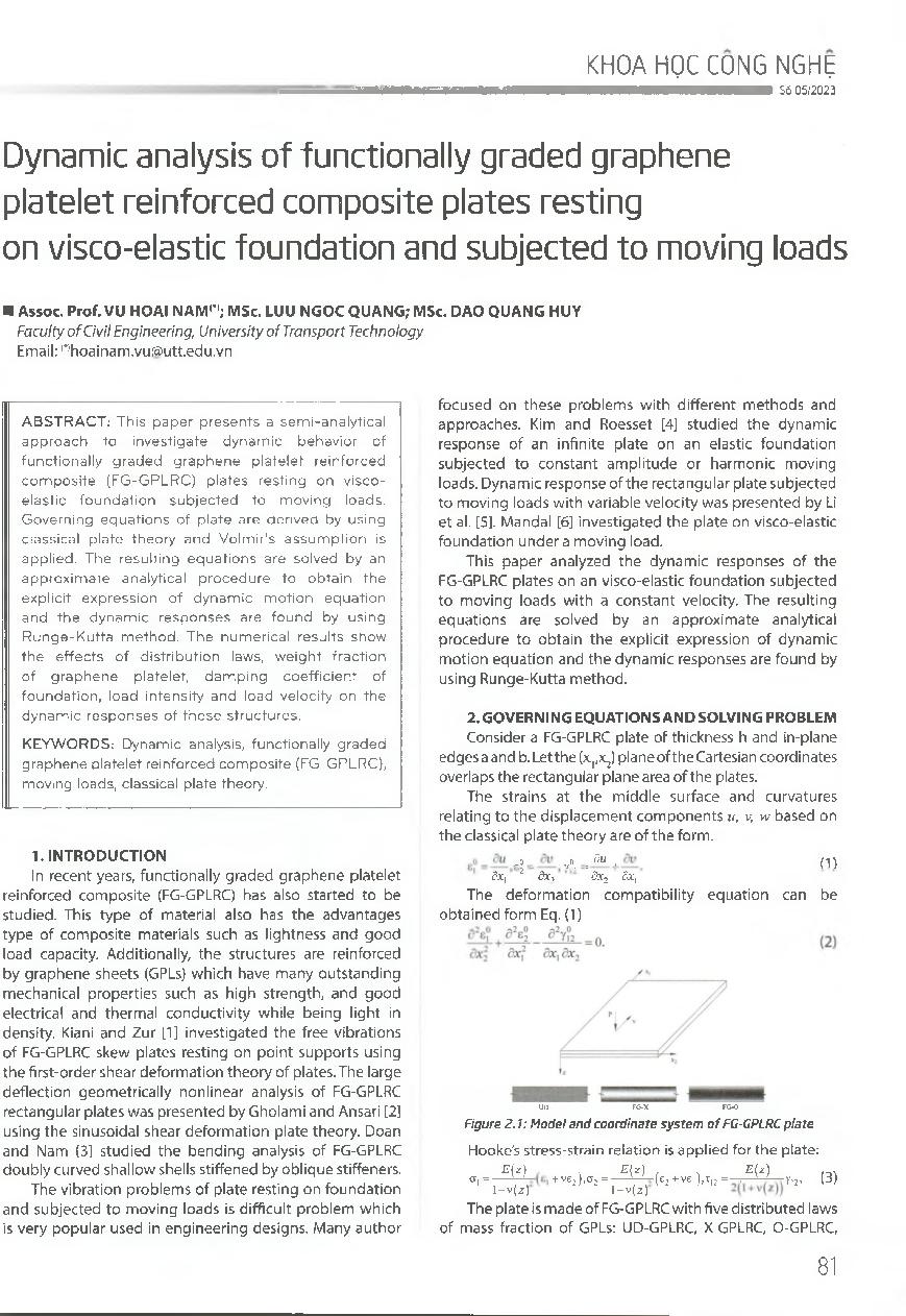 Phân tích động của các tấm composite được gia cố bằng tiểu cầu graphene được phân loại theo chức năng nằm trên nền đàn hồi nhớt và chịu tải trọng chuyển động = Dynamic analysis of functionally graded graphene platelet reinforced composite plates resting o