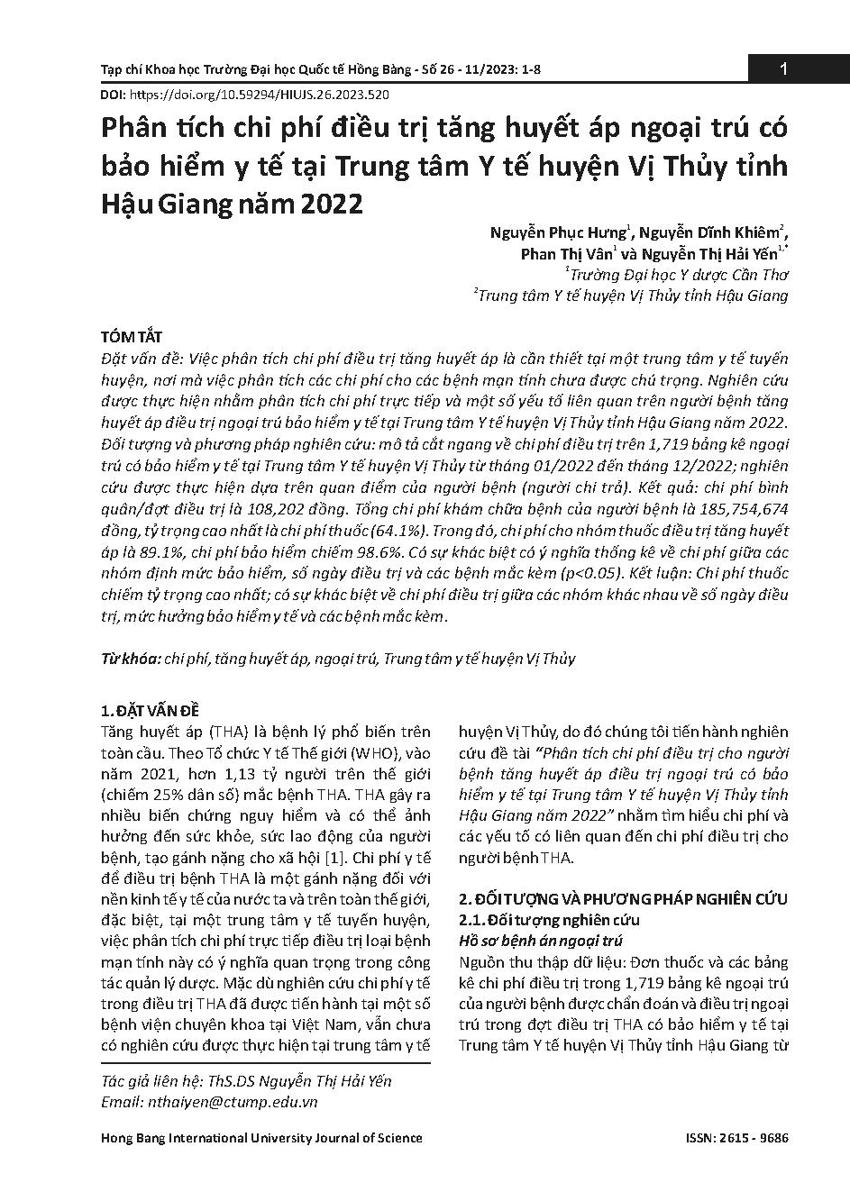 Phân tích chi phí điều trị tăng huyết áp ngoại trú có bảo hiểm y tế tại Trung tâm Y tế huyện Vị Thủy tỉnh Hậu Giang năm 2022 = Cost for insured outpatients with hypertension at Vi Thuy district health center in 2022