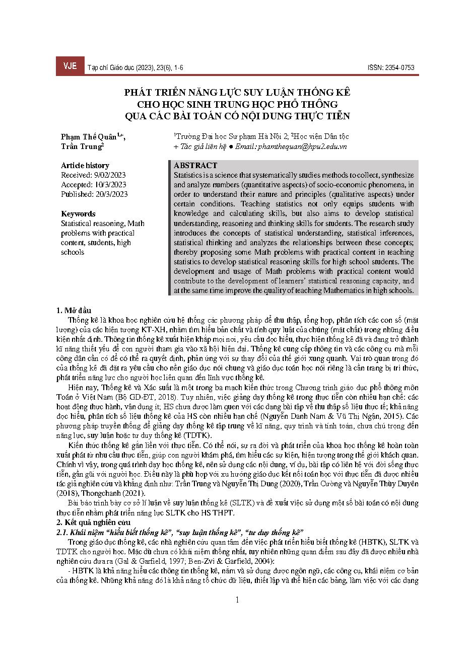 Phát triển năng lực suy luận thống kê cho học sinh trung học phổ thông qua các bài toán có nội dung thực tiễn = Develop statistical reasoning capacity for high school students through problems with practical content