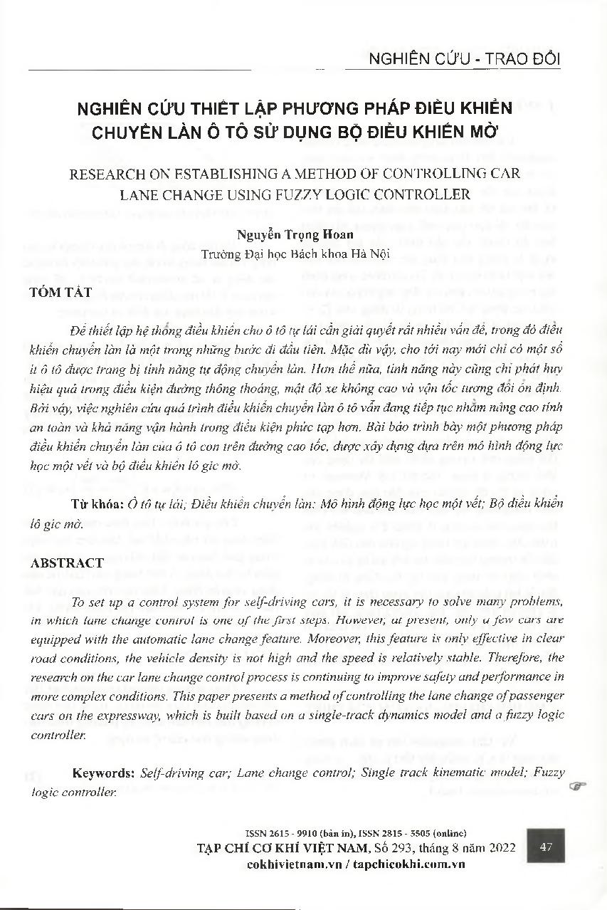 Nghiên cứu thiết lập phương pháp điều khiển chuyển làn ô tô sử dụng bộ điều khiển mờ = Research on establishing a method of controlling car lane change using fuzzy logic controller
