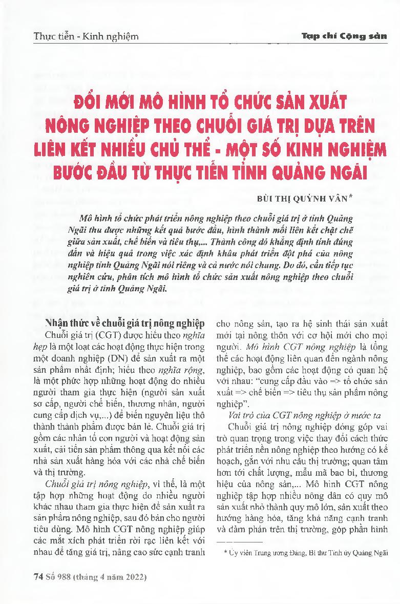 Đổi mới mô hình tổ chức sản xuất nông nghiệp theo chuỗi giá trị dựa trên liên kết nhiều chủ thể - Một số kinh nghiệm bước đầu từ thực tiễn tỉnh Quảng Ngãi = Renovating the model of agricultural production organization according to the value chain based on