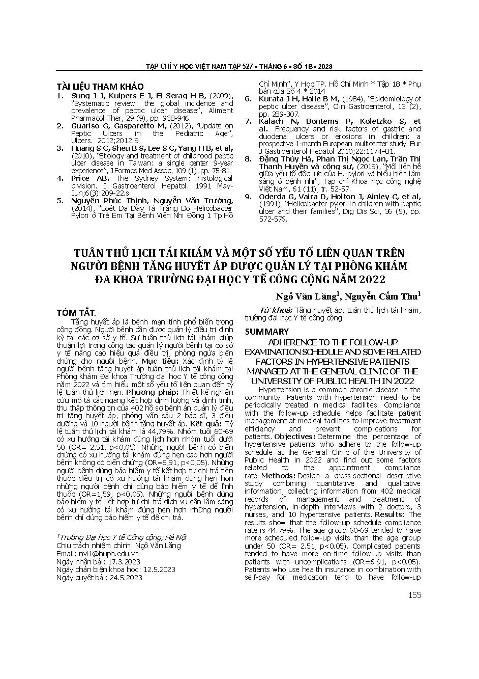 Tuân thủ lịch tái khám và một số yếu tố liên quan trên người bệnh tăng huyết áp được quản lý tại Phòng khám Đa khoa Trường Đại học Y tế Công cộng năm 2022 = Adherence to the follow-up examination schedule and some related factors in hypertensive patients