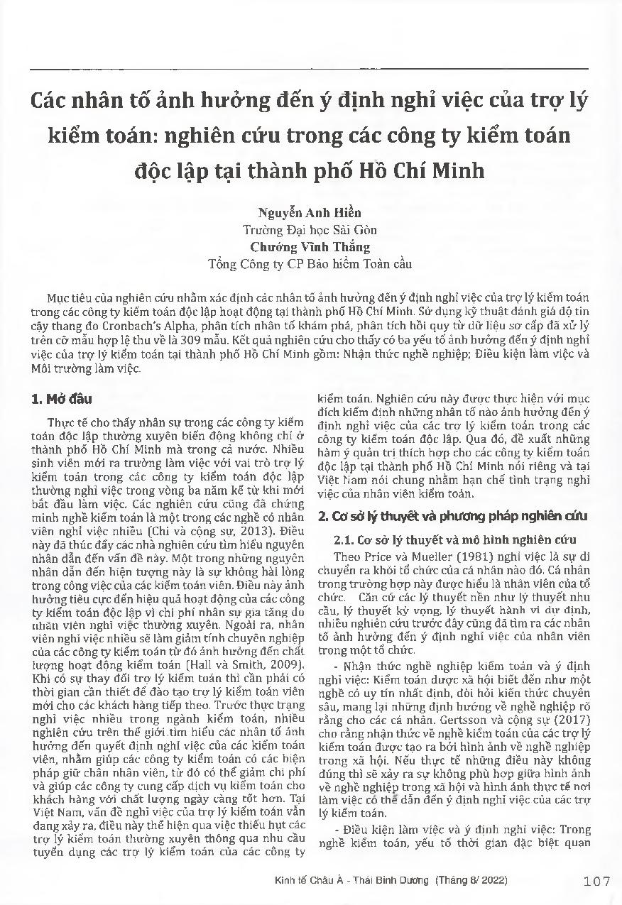 Các nhân tố ảnh hưởng đến ý định nghỉ việc của trợ lý kiểm toán: nghiên cứu trong các công ty kiểm toán độc lập tại thành phố Hồ Chí Minh