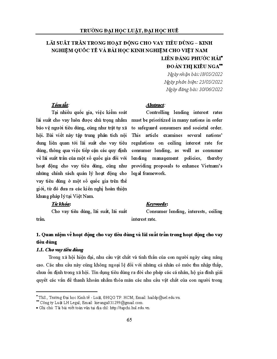 Lãi suất trần trong hoạt động cho vay tiêu dùng – kinh nghiệm quốc tế và bài học kinh nghiệm cho Việt Nam = Interest rate ceiling in consumer lending activities – international experience and lessons for Vietnam