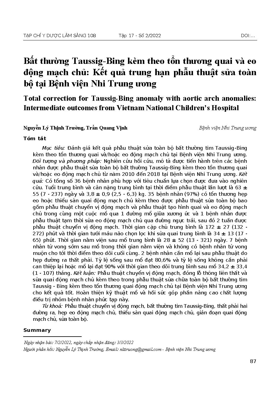 Bất thường Taussig-Bing kèm theo tổn thương quai và eo động mạch chủ: Kết quả trung hạn phẫu thuật sửa toàn bộ tại Bệnh viện Nhi Trung ương = Total correction for Taussig-Bing anomaly with aortic arch anomalies: Intermediate outcomes from Vietnam National