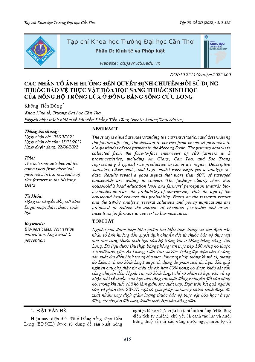 Các nhân tố ảnh hưởng đến quyết định chuyển đổi sử dụng thuốc bảo vệ thực vật hóa học sang thuốc sinh học của nông hộ trồng lúa ở Đồng bằng sông Cửu Long = The determinants behind the conversion from chemical pesticides to bio-pesticides of rice farmers i