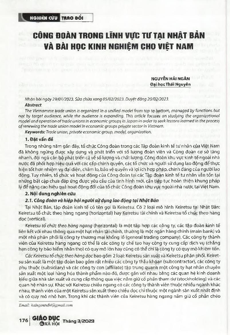 Công đoàn trong lĩnh vực tư tại Nhật Bản và bài học kinh nghiệm cho Việt Nam = Trade unions in the private sector in Japan and lessons for Vietnam.