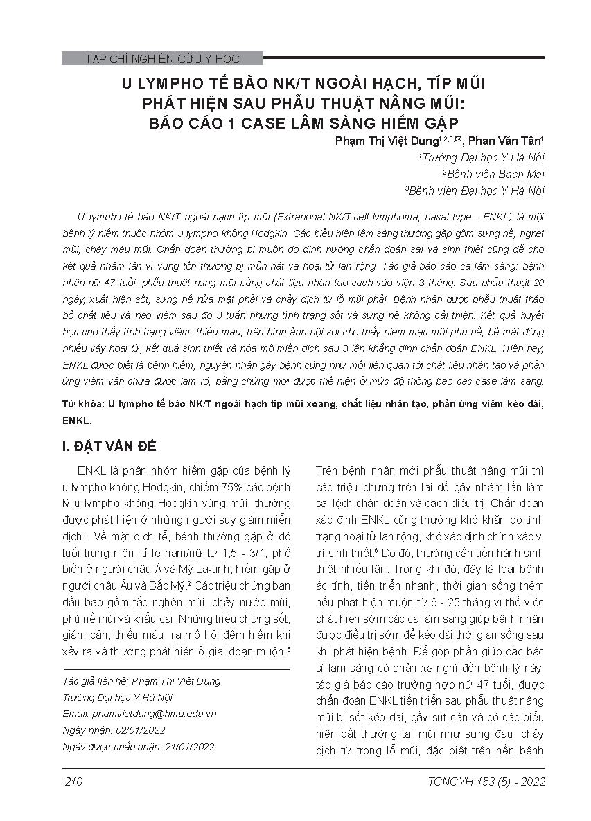 U lympho tế bào NK/T ngoài hạch, típ mũi phát hiện sau phẫu thuật nâng mũi: Báo cáo 1 case lâm sàng hiếm gặp = Extranodal nk/t-cell lymphoma, nasal type diagnosed after rhinoplasty: a rare case report