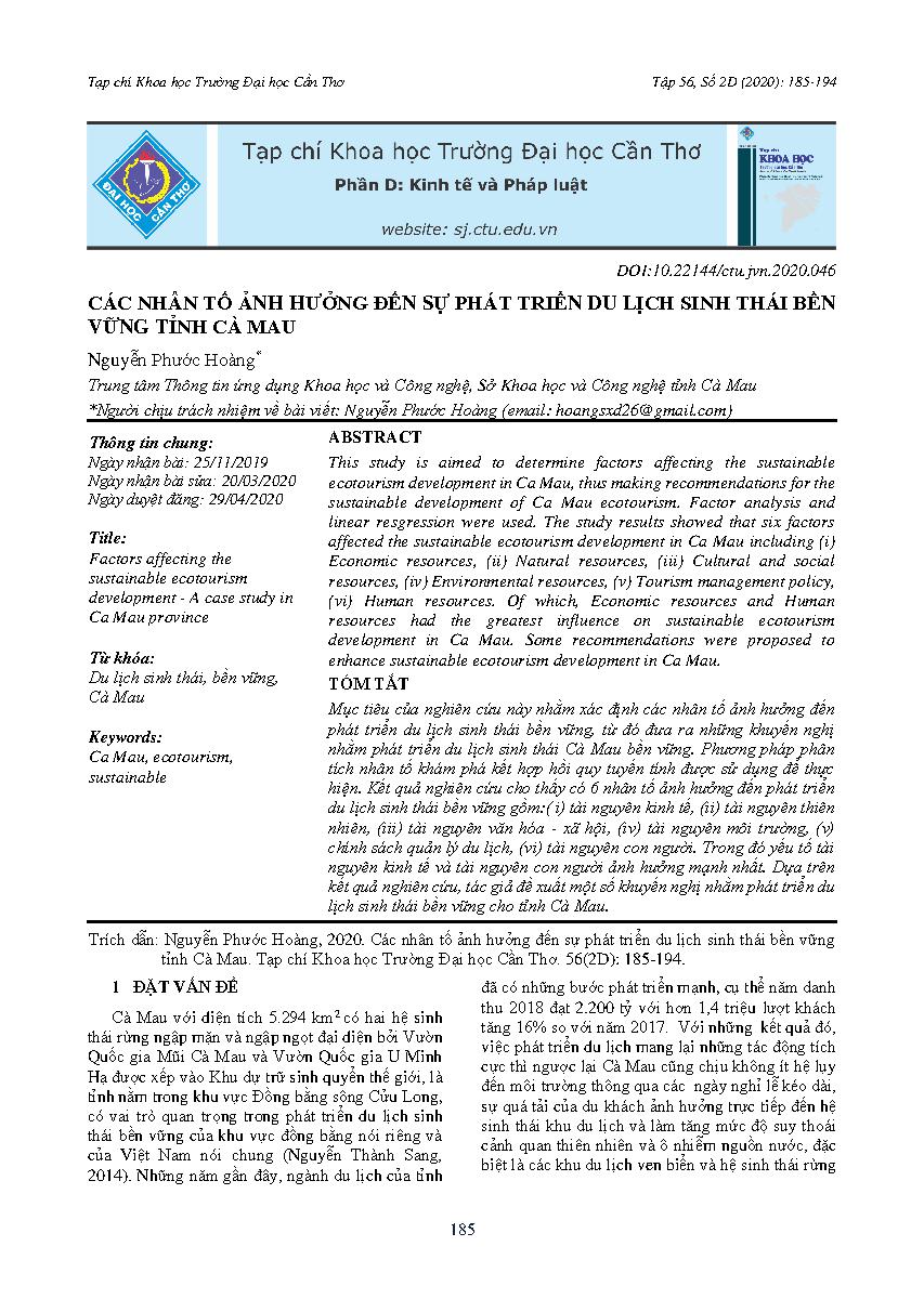 Các nhân tố ảnh hưởng đến sự phát triển du lịch sinh thái bền vững tỉnh Cà Mau = Factors affecting the sustainable ecotourism development - A case study in Ca Mau province