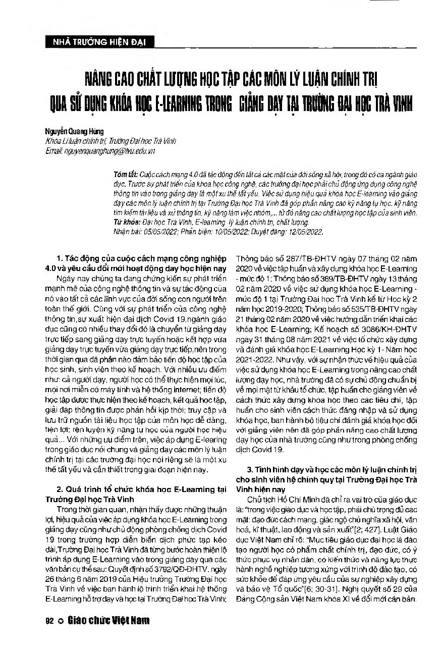 Nâng cao chất lượng học tập các môn Lý luận chính trị qua sử dụng khóa học E-learning trong giảng dạy tại trường Đại học Trà Vinh = Improving the learning quality of political theory subjects through the use of E-learning courses in teaching at Tra Vinh U