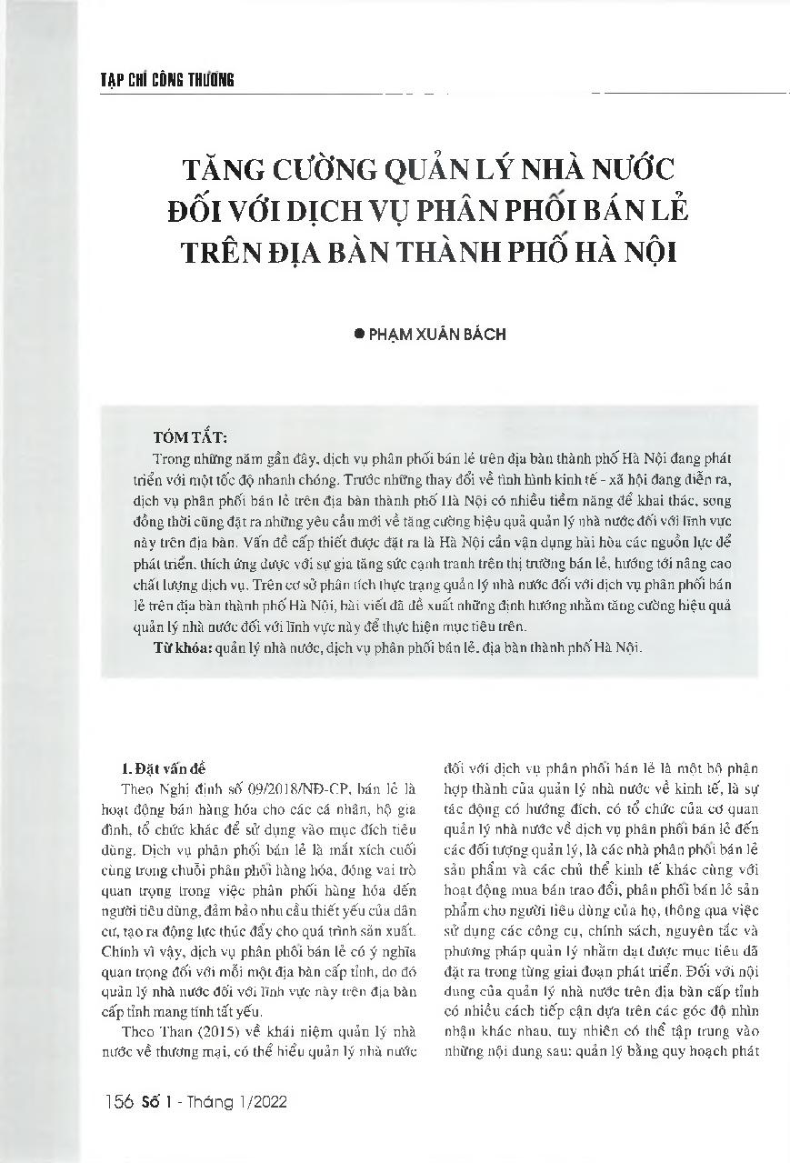 Tăng cường quản lý nhà nước đối vói dịch vụ phân phối bán lẻ trên địa bàn thành phố Hà Nội = Strengthening the State management in the retail sector in Hanoi