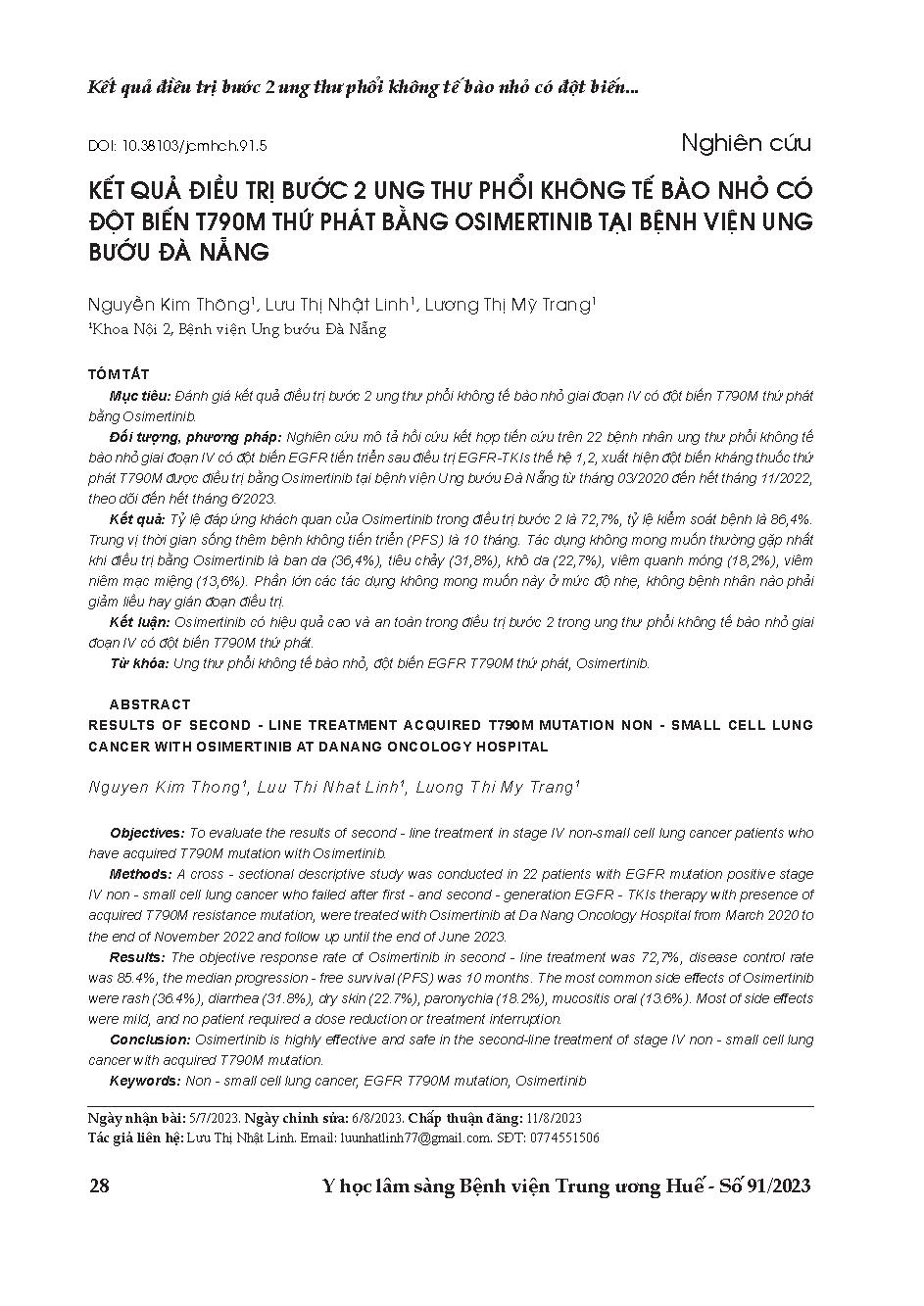 Kết quả điều trị bước 2 ung thư phổi không tế bào nhỏ có đột biến T790M thứ phát bằng osimertinib tại Bệnh viện ung bướu Đà Nẵng = Results of second - line treatment acquired T790M mutation non - small cell lung cancer with osimertinib at Da Nang oncology
