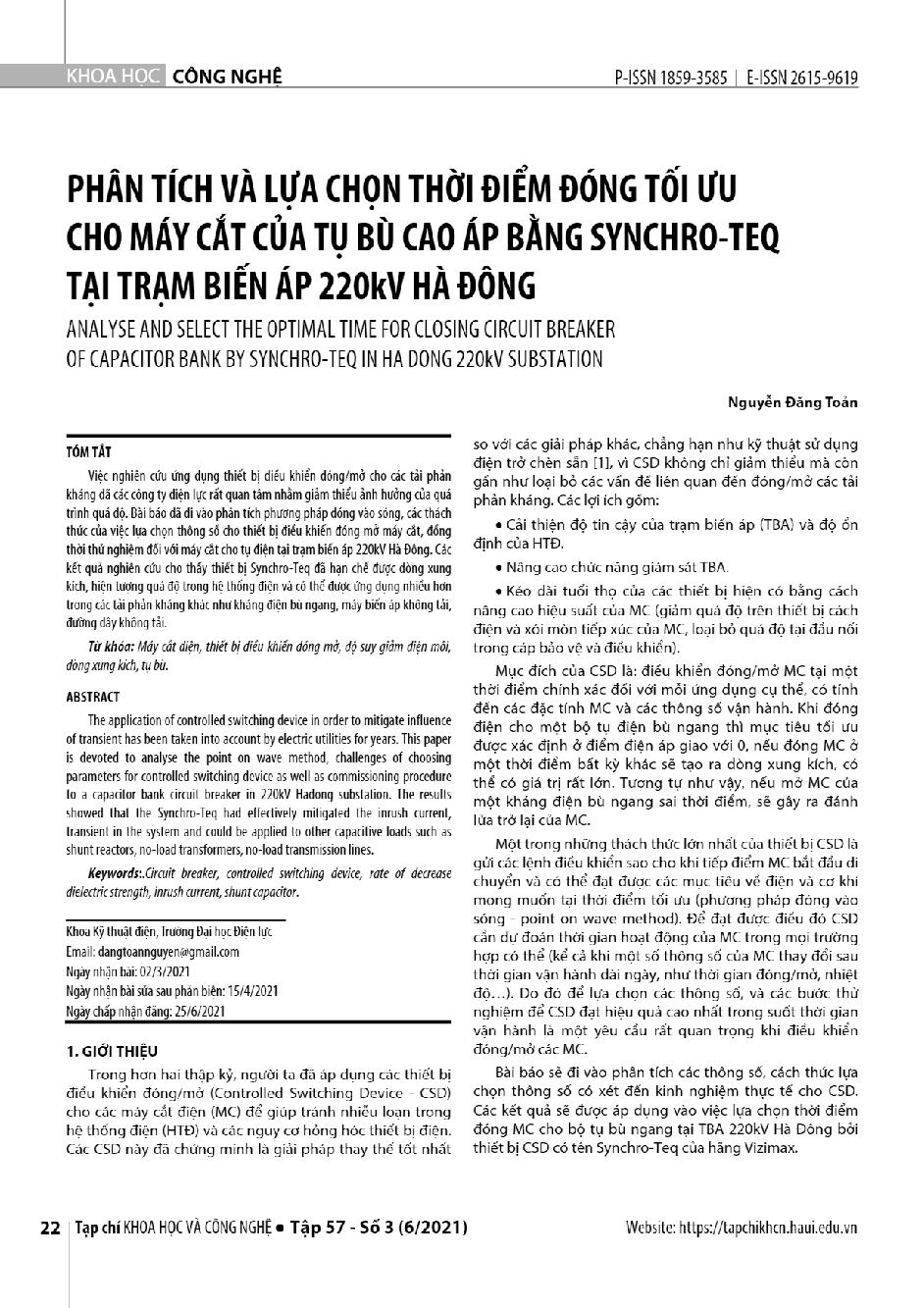 Phân tích và lựa chọn thời điểm đóng tối ưu cho máy cắt của tụ bù cao áp bằng synchro-TEQ tại trạm biến áp 220kV Hà Đông = Analyse and select the optimal time for closing circuit breaker of capacitor bank by synchro-TEQ in Ha Dong 220kV substation