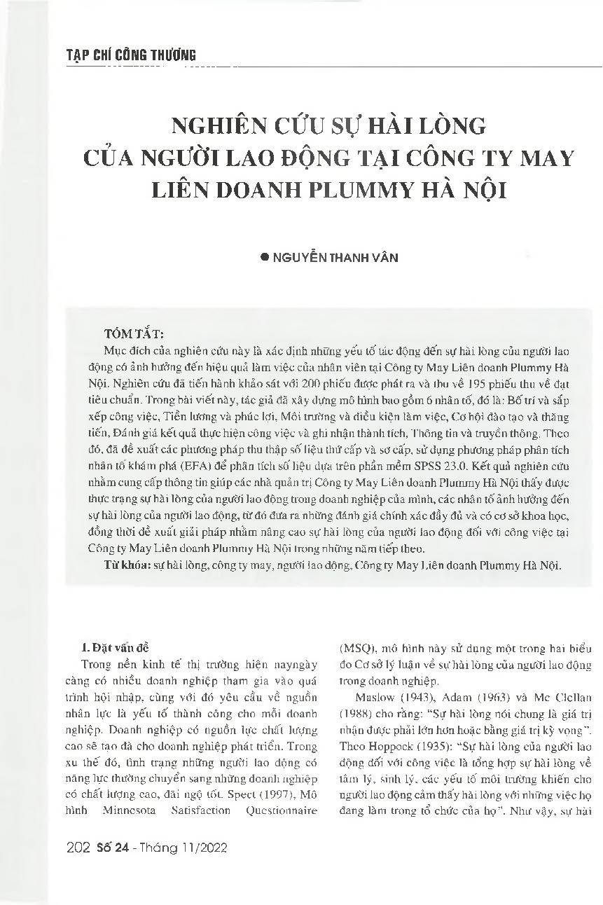 Nghiên cứu sự hài lòng của người lao động tại công ty May Liên doanh Plummy Hà Nội = A study on the employee satisfaction at Plummy Hanoi Garment Joint Venture Company