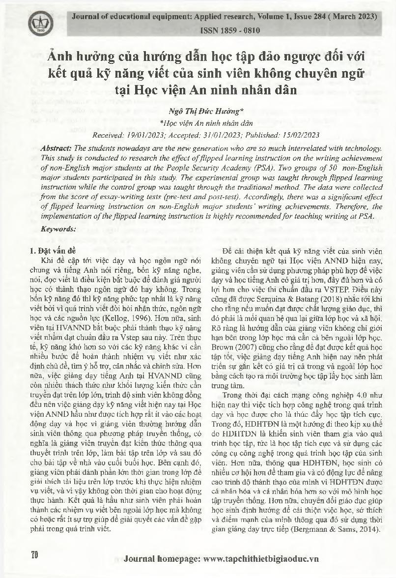 Ảnh hưởng của hướng dẫn học tập đảo ngược đối với kết quả kỹ năng viết của sinh viên không chuyên ngữ tại Học viện An ninh nhân dân = The effect of flipped learning instruction on the writing skills results of non-language major students at the People's S