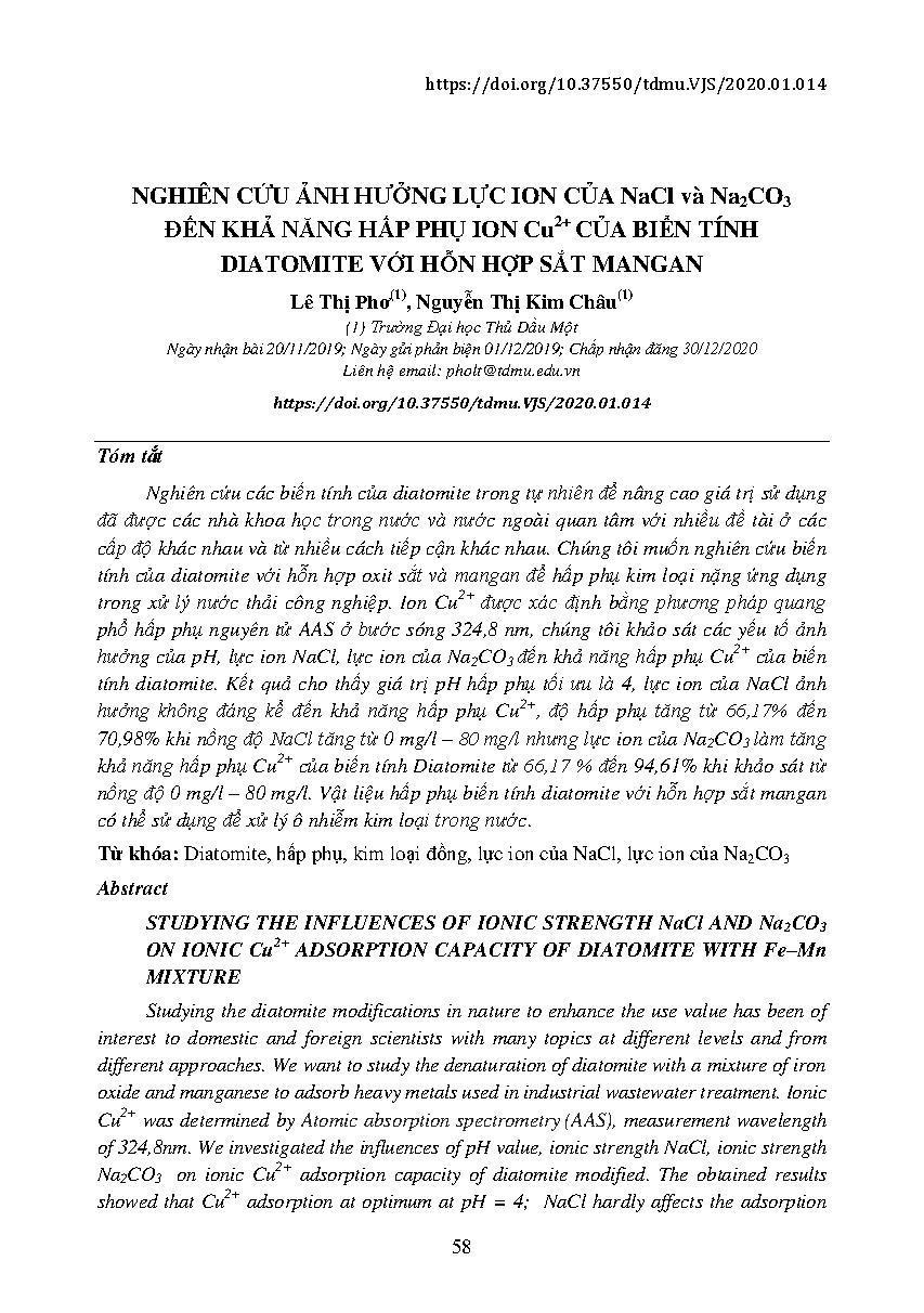 Nghiên cứu ảnh hưởng lực ion của NaCl và Na2CO3 đến khả năng hấp phụ ion Cu2+ của biến tính diatomite với hỗn hợp sắt mangan = Studying the influences of ionic strength NaCl and Na2CO3 on ionic Cu2+ adsorption capacity of diatomite with Fe–Mn mixture