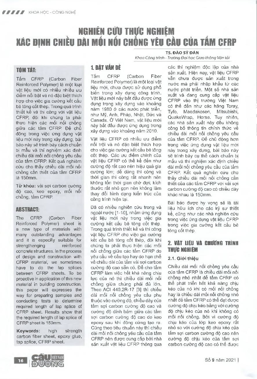 Nghiên cứu thực nghiệm xác định chiều dài mối nối chồng yêu cầu của tấm CFRP