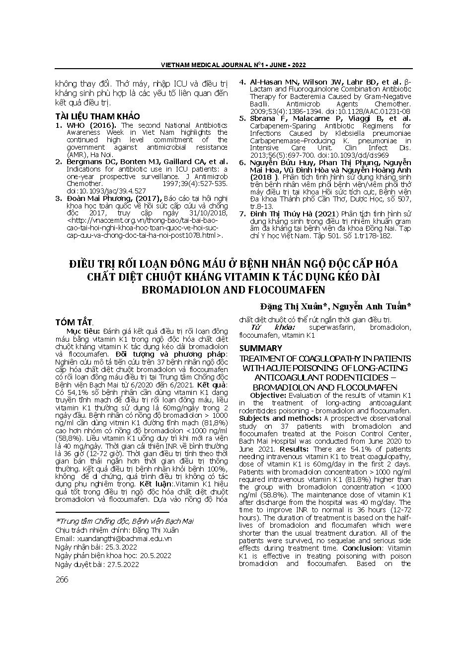 Điều trị rối loạn đông máu ở bệnh nhân ngộ độc cấp hóa chất diệt chuột kháng vitamin K tác dụng kéo dài Bromadiolone và Flocoumafen = Treatment of coagulopathy in patients with acute poisoning of long-acting anticoagulant rodenticides – bromadiolone and f