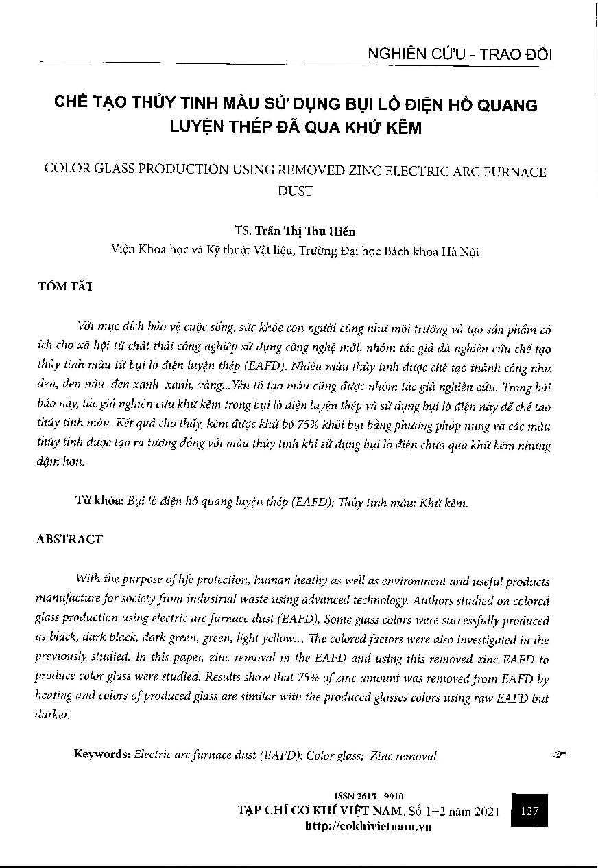 Chế tạo thủy tinh màu sử dụng bụi lò điện hồ quang luyện thép đã qua khử kẽm = Color glass production using removed zinc electric arc furnace dust