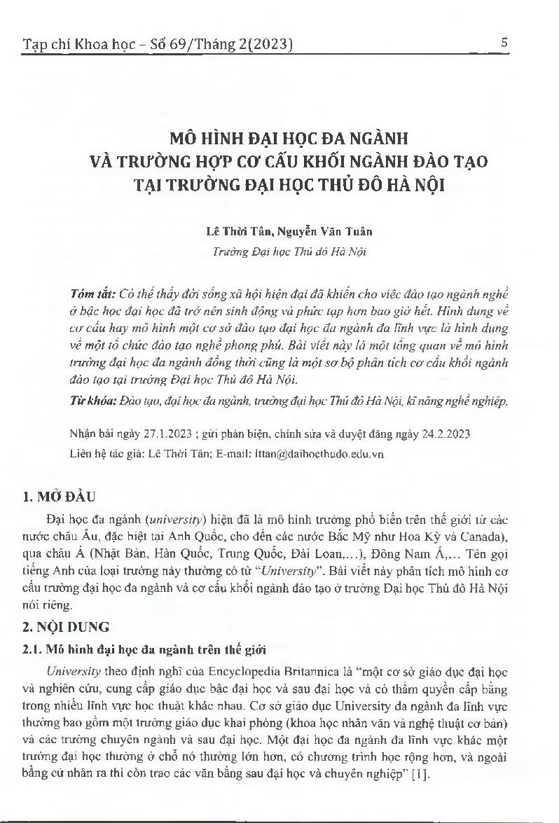 Mô hình đại học đa ngành và trường hợp cơ cấu khối ngành đào tạo tại trường Đại học Thủ đô Hà Nội = The concept of higher education and the case of training sector at Hanoi Metropolitan University
