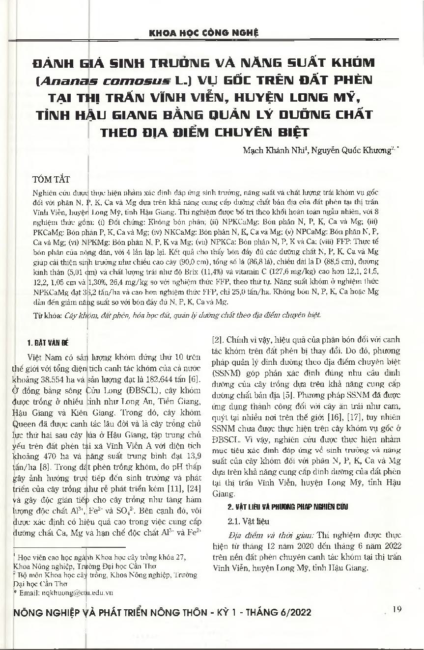 Đánh giá sinh trưởng và năng suất khóm (Ananas comosus L.) vụ gốc trên đất phèn tại thị trấn Vĩnh Viễn, huyện Long Mỹ, tỉnh Hậu Giang bằng quản lý dưỡng chất theo địa điểm chuyên biệt = Evaluation of growth and yield of pineapple ratoon on acid sulfate so
