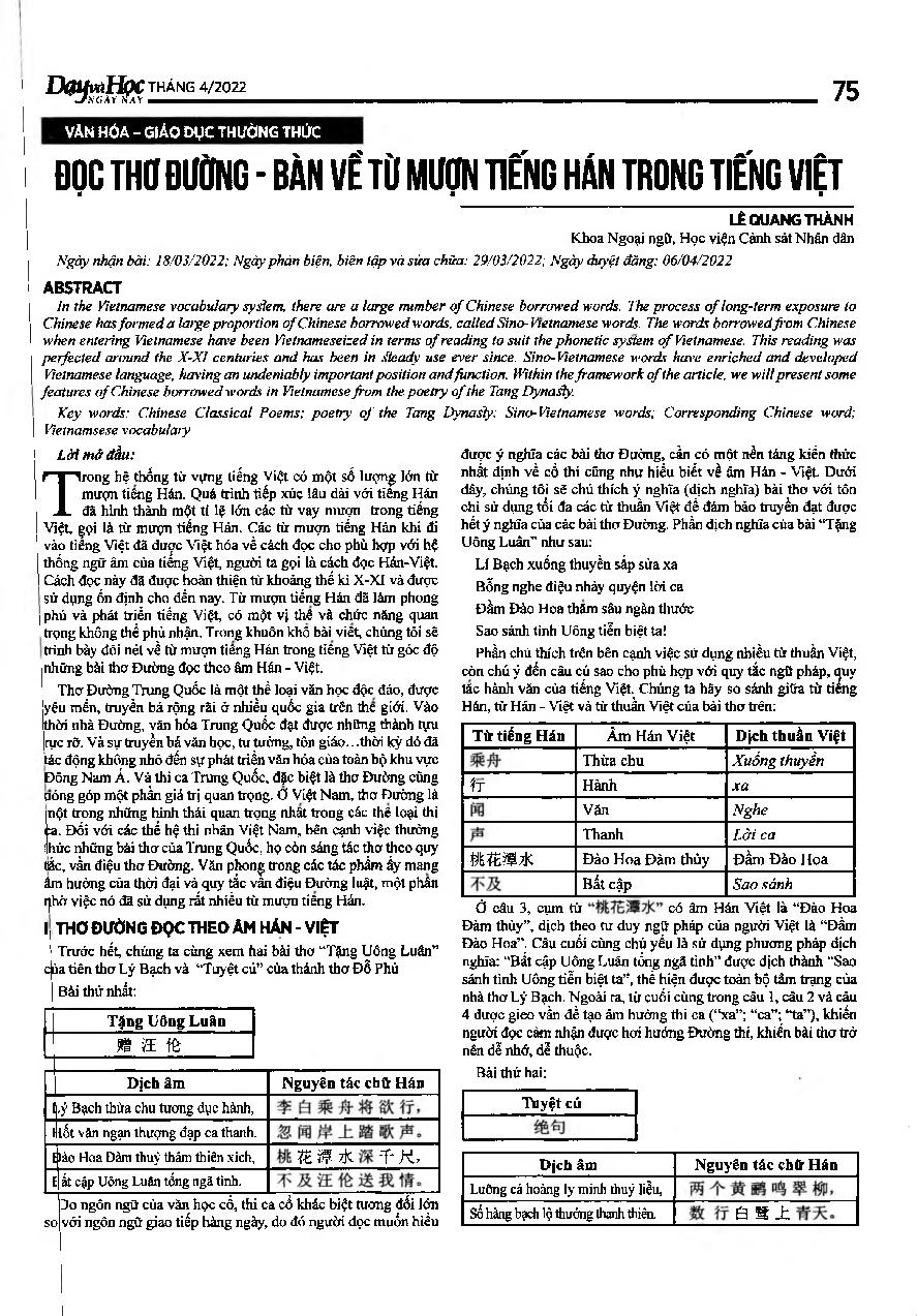 Đọc thơ Đường - Bàn về từ mượn tiếng Hán trong tiếng Việt = Reading poetry of the Tang Dynasty - Analyzing the Sino - Vietnamese words