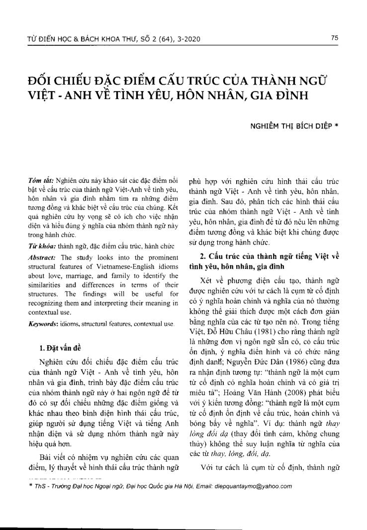 Đối chiếu đặc điểm cấu trúc của thành ngữ Việt - Anh về tình yêu, hôn nhân, gia đình = A contrastive analysis on the structural features of Vietnamese-English idioms about love, marriage and family