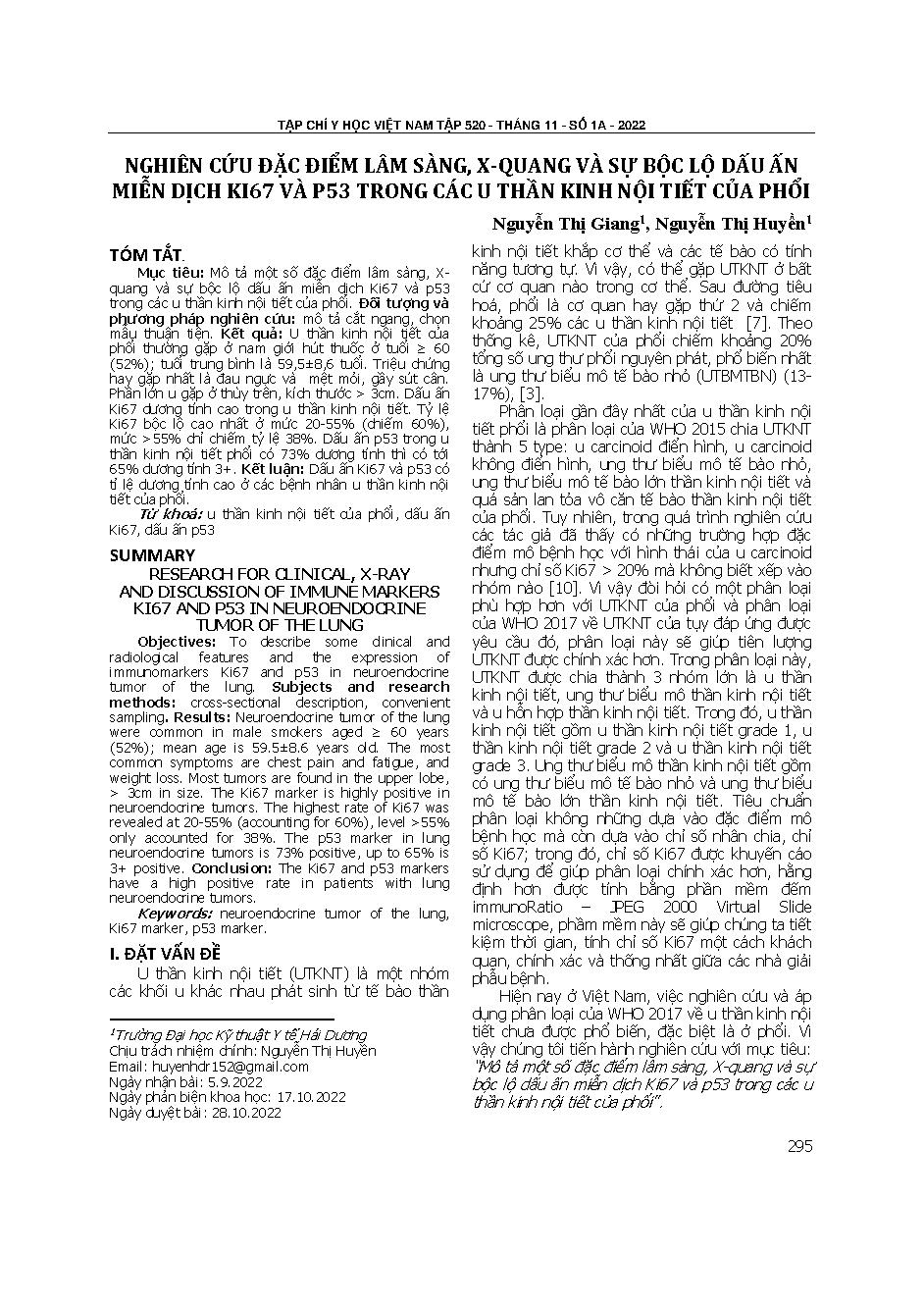 Nghiên cứu đặc điểm lâm sàng, X-quang và sự bộc lộ dấu ấn miễn dịch KI67 và P53 trong các u thần kinh nội tiết của phổi = Research for clinical, X-ray and discussion of immune markers KI67 and P53 in neuroendocrine tumor of the lung