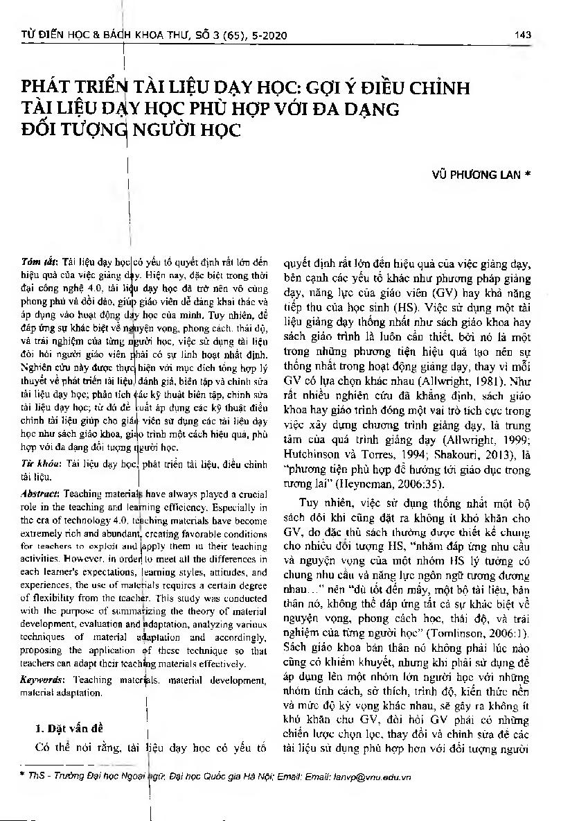 Phát triển tài liệu dạy học: gợi ý điều chỉnh tài liệu dạy học phù hợp với đa dạng đối tượng người học = Teaching material development: How to adapt the teaching materials to meet various learners' needs