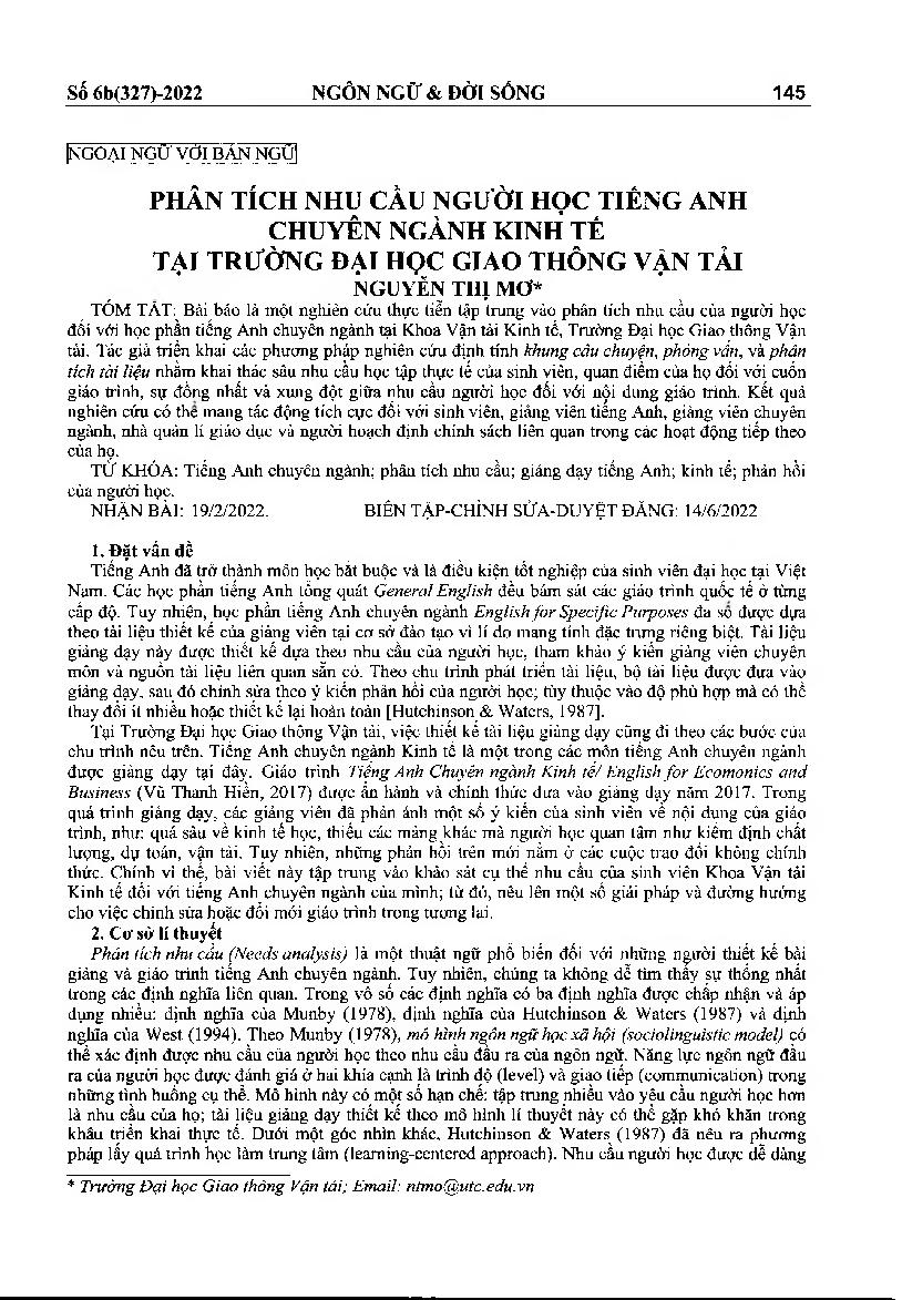 Phân tích nhu cầu người học tiếng anh chuyên ngành kinh tế tại Trường Đại học Giao thông vận tải = An analysis of learners’ needs for English for business and economics at the University of Transport and Communications