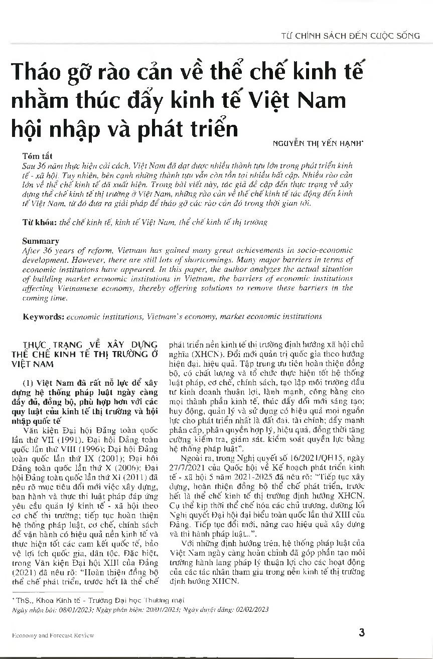 Tháo gỡ rào cản về thể chế kinh tế nhằm thúc đẩy kinh tế Việt Nam hội nhập và phát triển = Removing barriers to economic institutions to promote Vietnam's economic integration and development