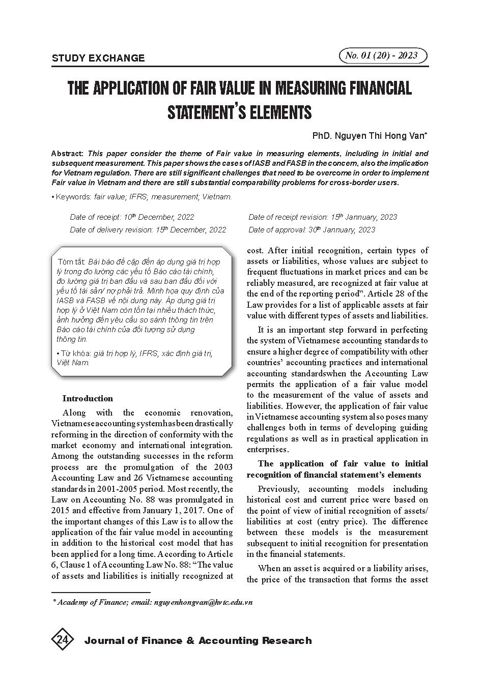 Vận dụng giá trị hợp lý để đánh giá các yếu tố của báo cáo tài chính = The application of fair value in measuring financial statement's elements