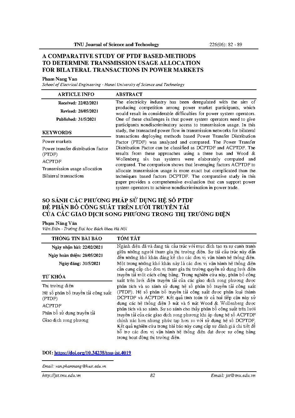 So sánh các phương pháp sử dụng hệ số ptdf để phân bổ công suất trên lưới truyền tải của các giao dịch song phương trong thị trường điện = A comparative study of ptdf based-methods to determine transmission usage allocation for bilateral transactions in power markets