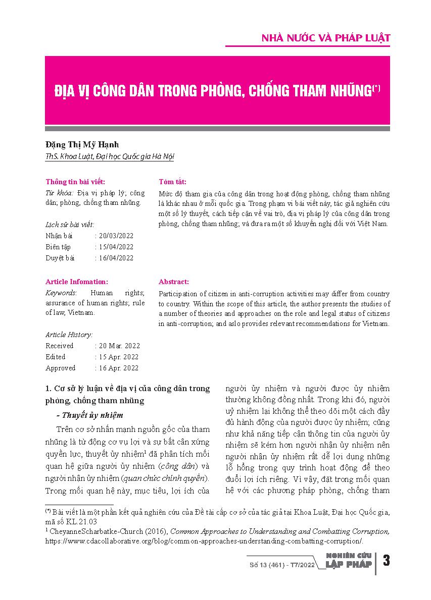 Địa vị công dân trong phòng, chống tham nhũng = Legal Status of Citizen in Anti-corruption