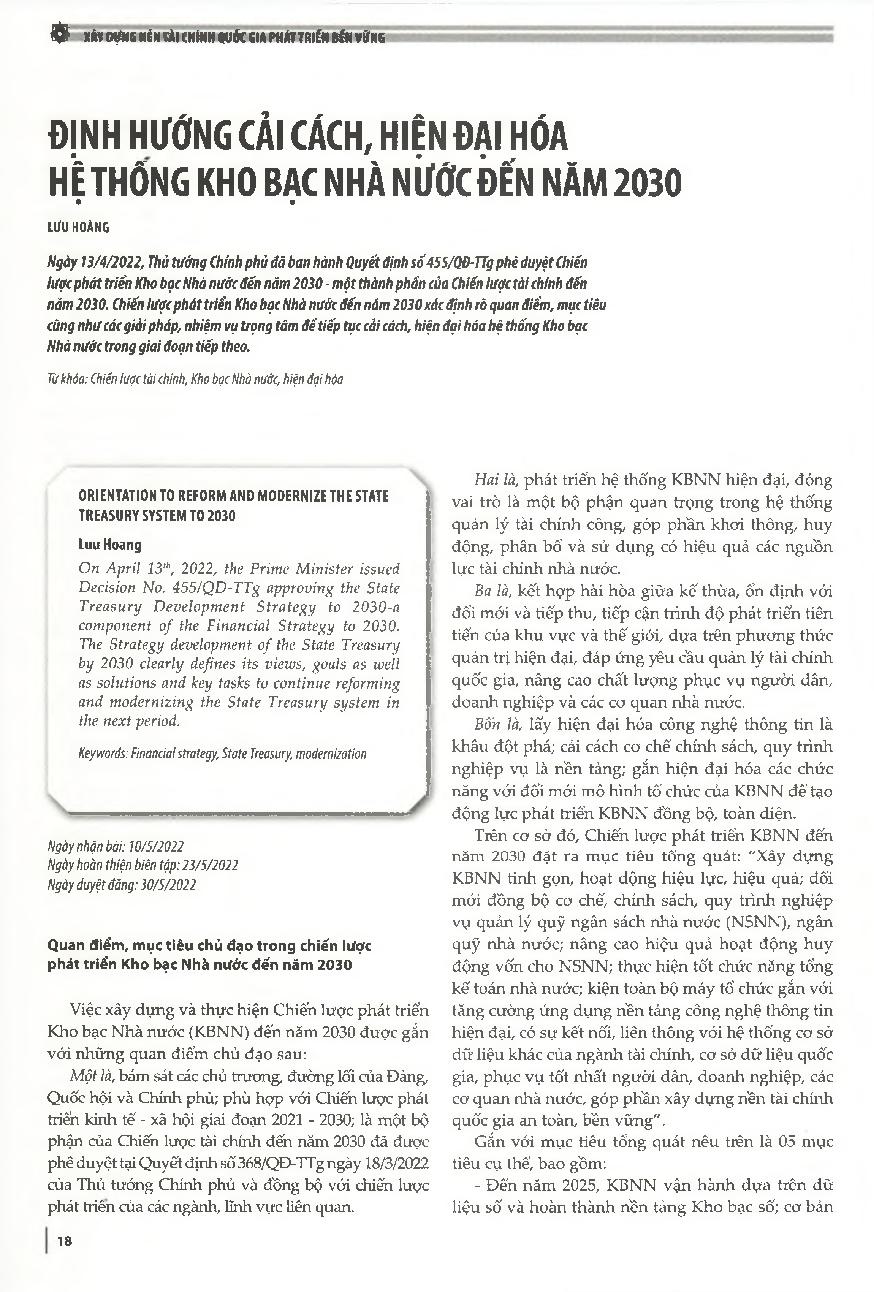 Định hướng cải cách, hiện đại hóa hệ thống Kho bạc Nhà nước đến năm 2030 = Orientation to reform and modernize the state Treasury system to 2030