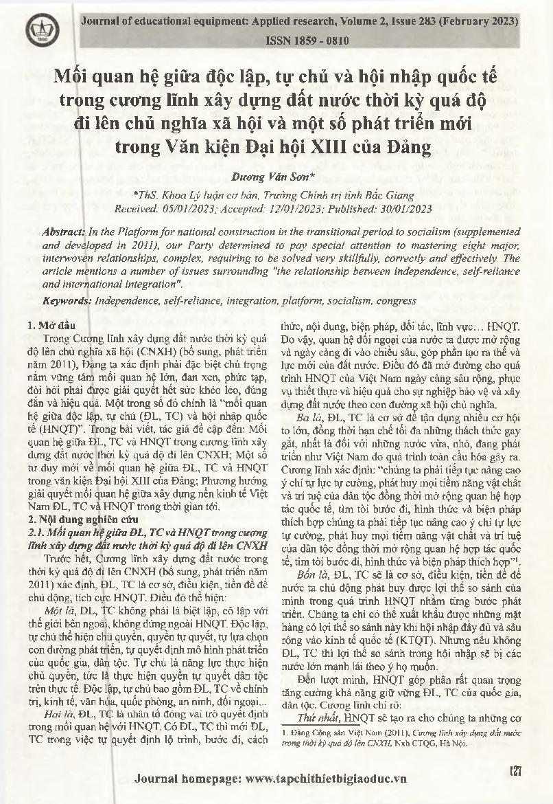 Mối quan hệ giữa độc lập, tự chủ và hội nhập quốc tế trong cương lĩnh xây dựng đất nước thời kỳ quá độ đi lên chủ nghĩa xã hội và một số phát triển mới trong Văn kiện Đại hội XIII của Đảng = The relationship between independence, autonomy and internationa