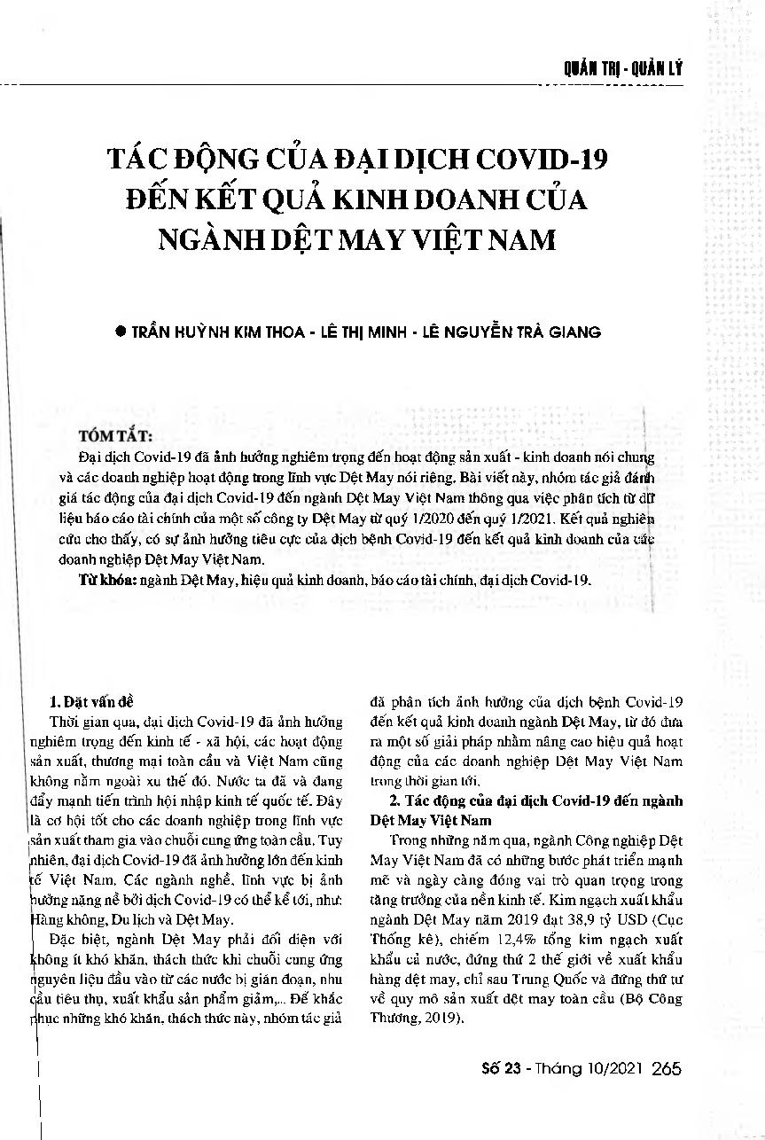 Tác động của đại dịch Covid-19 đến kết quả kinh doanh của ngành dệt may Việt Nam = Impacts of the Covid-19 pandemic on the garment and textile industry in Vietnam