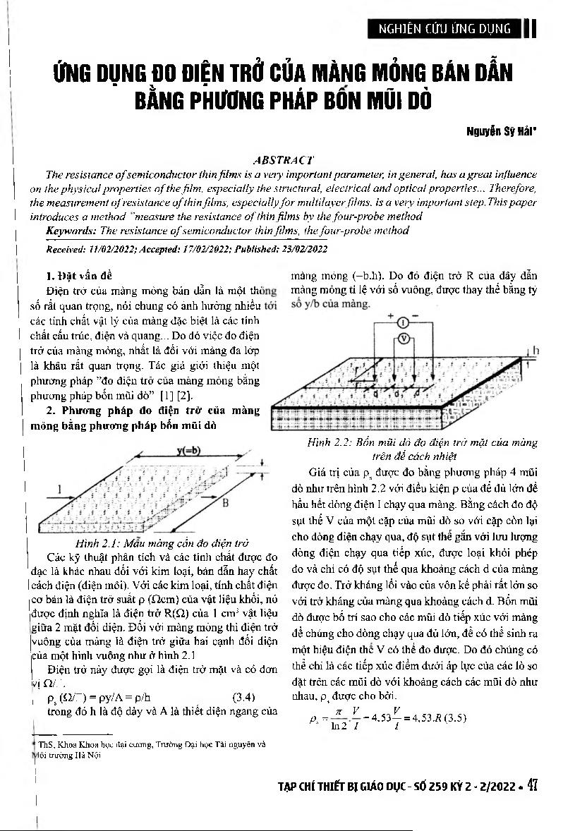 Ứng dụng đo điện trở của màng mỏng bán dẫn bằng phương pháp bốn mũi dò = Applying the measure of resistance of semiconductor thin films by the four-probe method