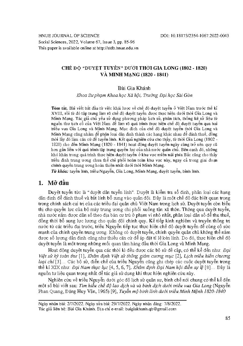 Chế độ “duyệt tuyển” dưới thời Gia Long (1802 - 1820) và Minh Mạng (1820 - 1841) = The military selection regime during the Gia Long (1802 - 1820) and Minh Mang (1820 - 1841) periods