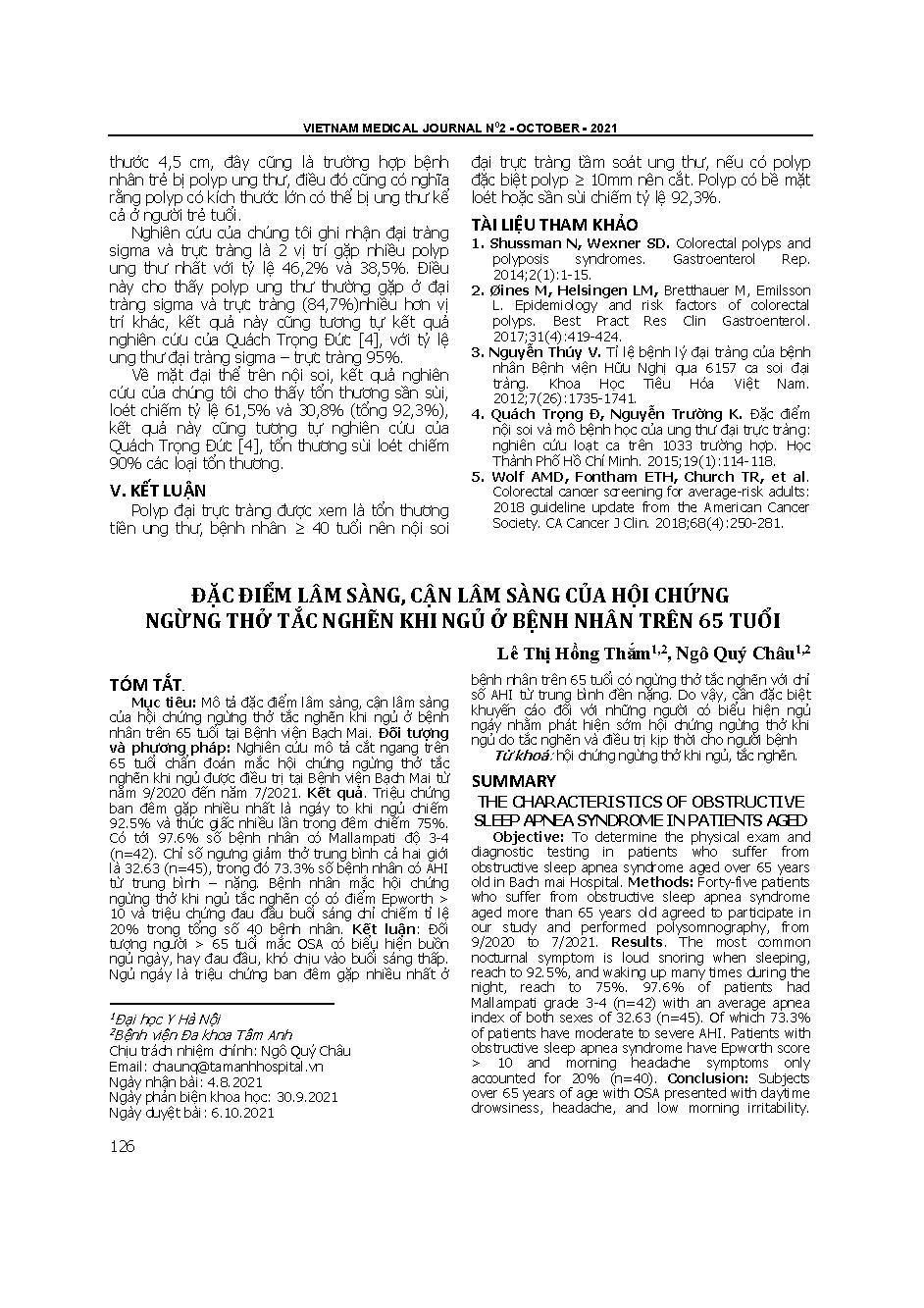 Đặc điểm lâm sàng, cận lâm sàng của hội chứng ngừng thở tắc nghẽn khi ngủ ở bệnh nhân trên 65 tuổi = The characteristics of obstructive sleep apnea syndrome in patients aged