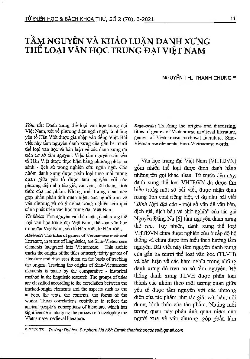 Tầm nguyên và khảo luận danh xưng thể loại văn học trung đại Việt Nam = Tracking the origins and discussing the titles o f some genres o f Vietnamese medieval literature
