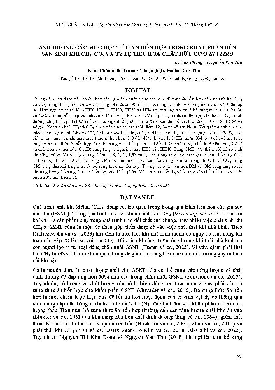 Ảnh hưởng các mức độ thức ăn hỗn hợp trong khẩu phần đến sản sinh khí CH4, CO2 và tỷ lệ tiêu hóa chất hữu cơ ở in vitro = Effects of supplementation concentrate in the diet on in vitro CH4, CO2 gas emissions and organic matter digestibility