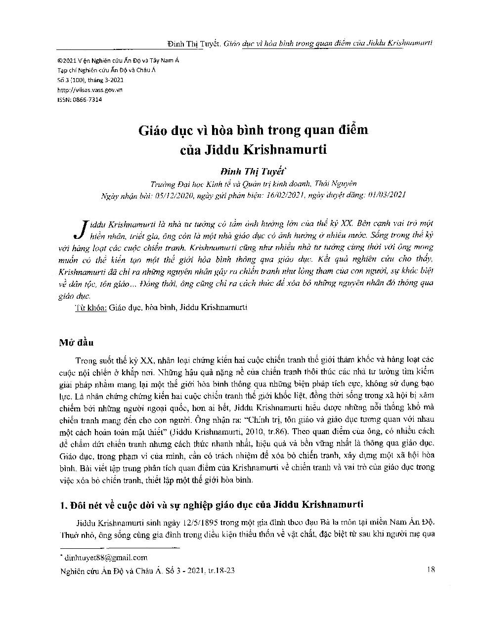 Giáo dục vì hòa bình trong quan điểm của Jiddu Krishnamurti = Education for peace in Jiddu Krishnamurti’s perspective