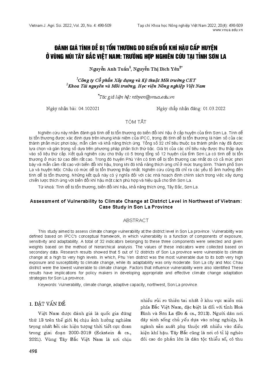 Đánh giá tính dễ bị tổn thương do biến đổi khí hậu cấp huyện ở vùng núi Tây Bắc Việt Nam: Trường hợp nghiên cứu tại tỉnh Sơn La = Assessment of vulnerability to climate change at district level in Northwest of Vietnam: Case study in Son La province