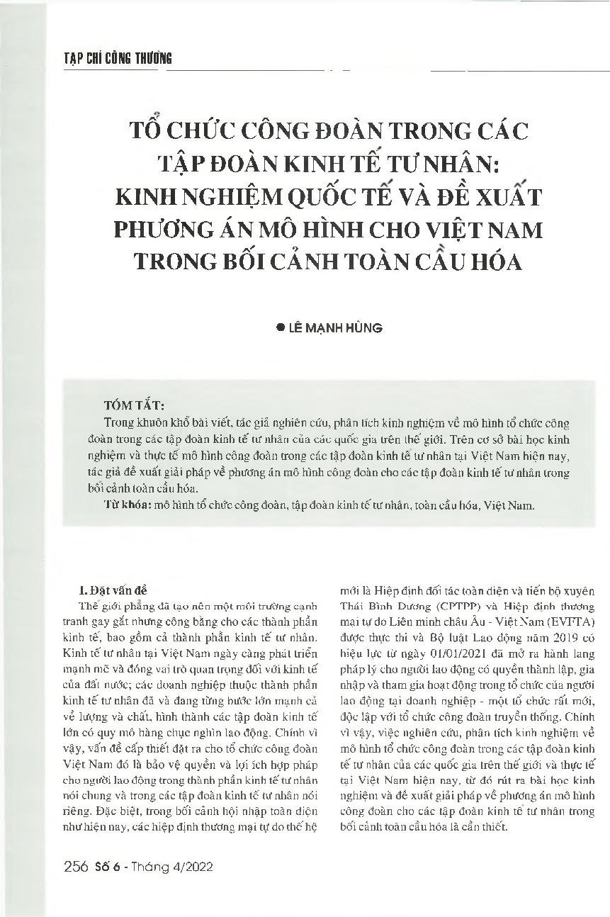 Tổ chức công đoàn trong tập đoàn kinh tế tư nhân: Kinh nghiệm quốc tế và đề xuất mô hình trong bối cảnh toàn cầu hóa = Organizing trade unions in private economic groups: International experience and solutions for models of organizing trade unions in Viet