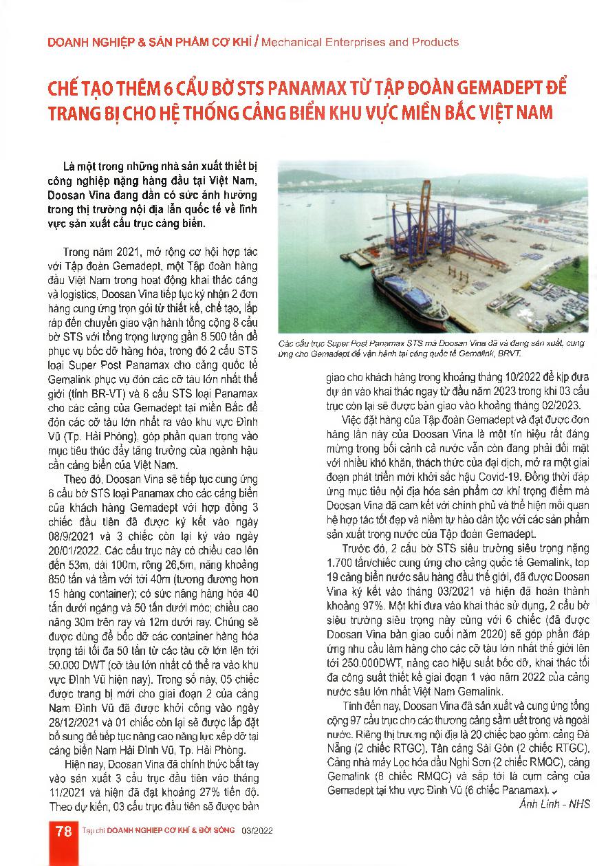 Chế tạo thêm 6 cẩu bờ STS Panamax từ Tập đoàn Gemadept để trang bị cho hệ thống cảng biển khu vực miền Bắc Việt Nam = Gemadept Group ordered 6 more Panamax STS cranes from Doosan Vina to equip the seaport system in the North
