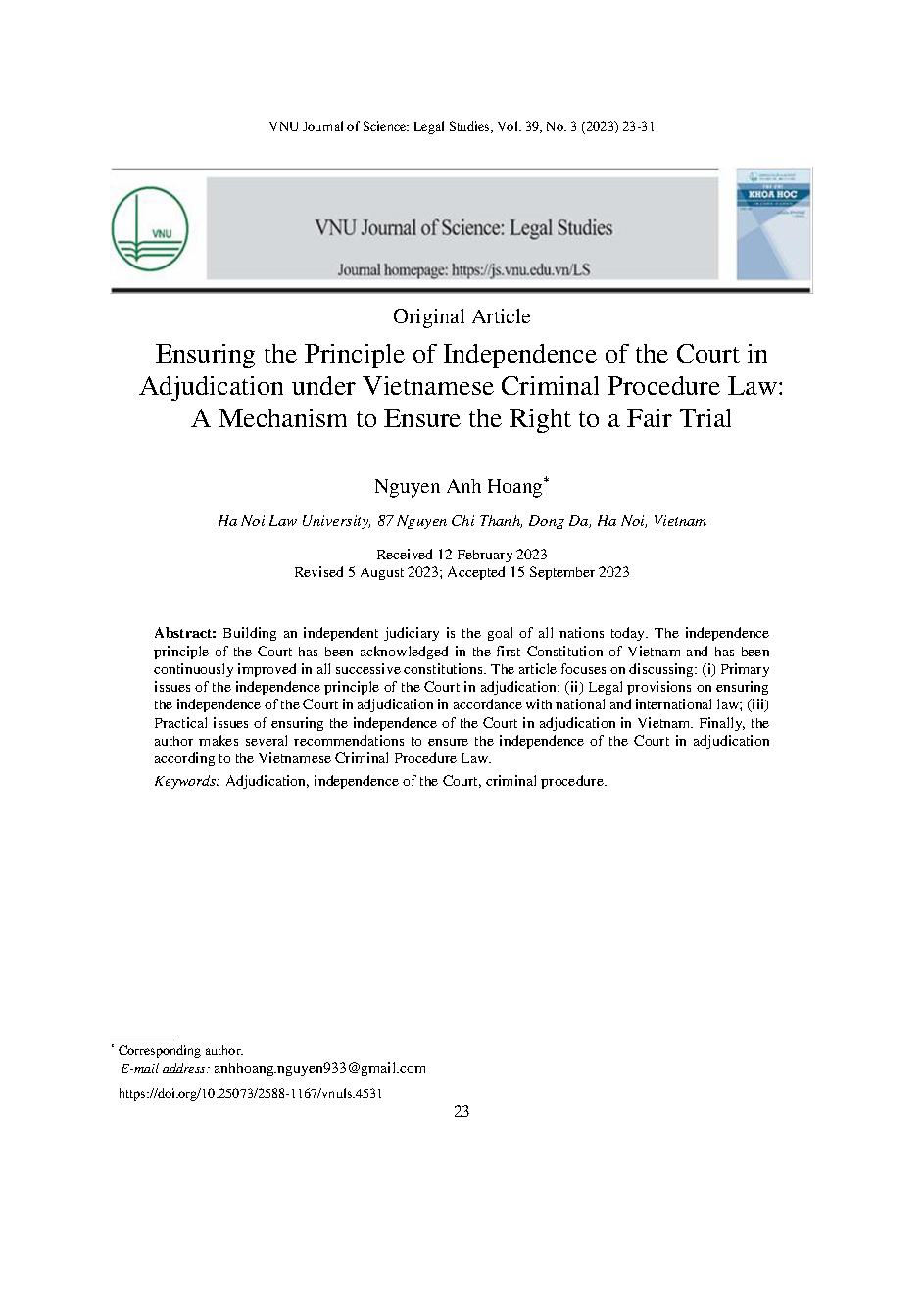 Bảo đảm nguyên tắc độc lập của tòa án trong việc xét xử theo pháp luật tố tụng hình sự Việt Nam: một cơ chế bảo đảm quyền được xét xử công bằng = Ensuring the principle of independence of the court in adjudication under Vietnamese criminal procedure law: