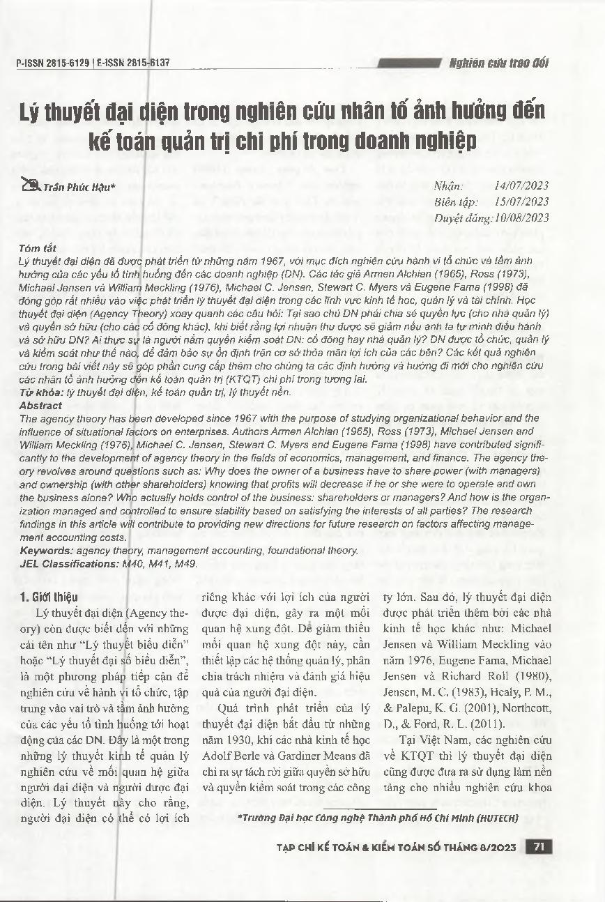 Lý thuyết đại diện trong nghiên cứu nhân tố ảnh hưởng đến kế toán quản trị chi phí trong doanh nghiệp
