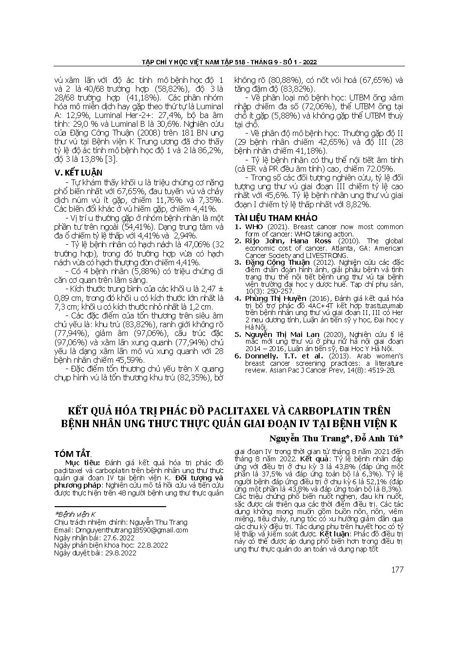 Kết quả hóa trị phác đồ paclitaxel và carboplatin trên bệnh nhân ung thư thực quản giai đoạn IV tại Bệnh viện K